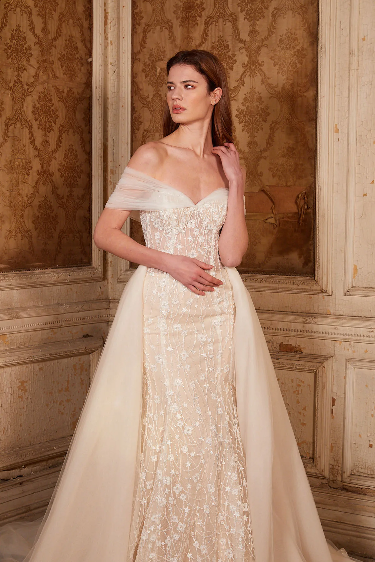 Demonte Kuyruklu Tül Kayık Yaka Dantelli Balık Gelinlik